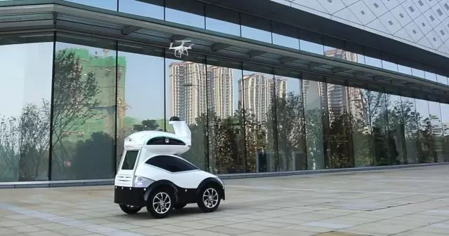 室外巡邏機器人APV其中最突出的一個特點就是可定制搭載無人機,在自主巡邏中可啟動無人機來監控機器人無法到達的區域。