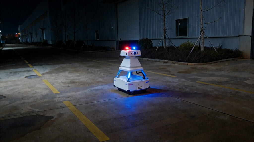 夜間威懾模式:針對夜間安保薄弱場景,機器人可開啟紅藍爆閃燈與高分貝警示音效,模擬警車巡邏效果,有效震懾潛在違規行為。